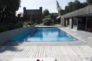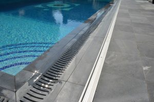 Grey sandblasted limestone featuring cool silver and charcoal tones, a softly textured slip-resistant surface, and refined contemporary character—ideal for sleek external pool surrounds and modern architectural landscapes.